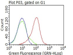 - Flow cytometric analysis of living 50 ng/mL IL2-stimulated Jurkat cells, using anti-CD5 antibody (TA802423), (red), compared to an IgG isotype control, (green), and negative control (PBS), (blue). (1:100)