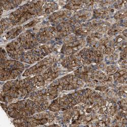 - Immunohistochemical staining of human stomach shows strong membranous and cytoplasmic positivity in glandular cells.
