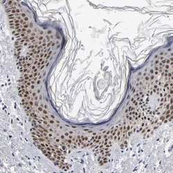 - Immunohistochemical staining of GRHL2 in human skin using a GRHL2 Polyclonal Antibody (Product # PA5-52116) shows strong nuclear positivity in squamous epithelial cells.