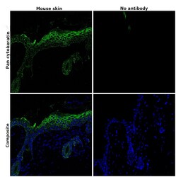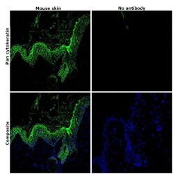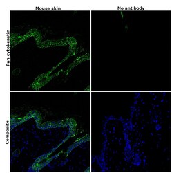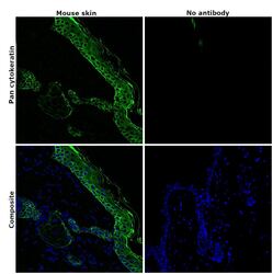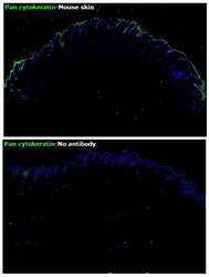- Immunohistochemical analysis of pan Cytokeratin was performed using formalin-fixed paraffin-embedded mouse skin tissue sections. To expose the target protein, heat-induced epitope retrieval was performed on de-paraffinized sections using eBioscience™ IHC Antigen Retrieval Solution - Low pH (10X) (Product # 00-4955-58) diluted to 1X solution in water in a microwave oven at 110 degree Celsius for 10 minutes. Following antigen retrieval, the sections were blocked with 2% normal goat serum in 1X PBS for 45 minutes at room temperature and then probed with or without Pan Cytokeratin Monoclonal Antibody (AE1/AE3), Alexa Fluor 488, eBioscience™ (Product # 53-9003-82) at 1:100 dilution in 0.1% normal goat serum overnight at 4 degree Celsius in a humidified chamber. ReadyProbes™ Tissue Autofluorescence Quenching Kit (Product # R37630) was used to quench autofluorescence from the tissues. Nuclei were stained with DAPI (Product # D1306) and the sections were mounted using ProLong™ Glass Antifade Mountant (Product # P36984). The images were captured on EVOS™ M7000 Imaging System (Product # AMF7000) at 20X magnification and externally deconvoluted.