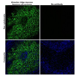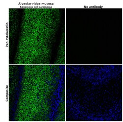- Immunohistochemical analysis of pan cytokeratin was performed using formalin-fixed paraffin-embedded alveolar ridge mucosa (squamous cell carcinoma) tissue sections. To expose the target protein, heat-induced epitope retrieval was performed on de-paraffinized sections using eBioscience™ IHC Antigen Retrieval Solution - High pH (10X) (Product # 00-4956-58) diluted to 1X solution in water in a decloaking chamber at 110 degree Celsius for 15 minutes. Following antigen retrieval, the sections were blocked with 2% normal goat serum in 1X PBS for 45 minutes at room temperature and then probed with or without Pan Cytokeratin Monoclonal Antibody (AE1/AE3), Alexa Fluor 488, eBioscience™ (Product # 53-9003-82) at 1:100 dilution in 0.1% normal goat serum overnight at 4 degree Celsius in a humidified chamber. ReadyProbes™ Tissue Autofluorescence Quenching Kit (Product # R37630) was used to quench autofluorescence from the tissues. Nuclei were stained with DAPI (Product # D1306) and the sections were mounted using ProLong™ Glass Antifade Mountant (Product # P36984). The images were captured on EVOS™ M7000 Imaging System (Product # AMF7000) at 20X magnification and deconvoluted externally.