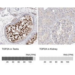 - Immunohistochemistry analysis in human testis and kidney tissues using Anti-TOP2A antibody. Corresponding TOP2A RNA-seq data are presented for the same tissues.