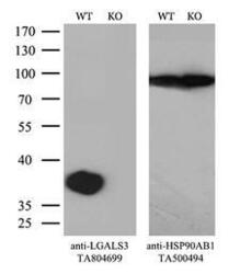 - Equivalent amounts of cell lysates and LGALS3-Knockout Hela cells were separated by SDS-PAGE and immunoblotted with anti-LGALS3 monoclonal antibodyThen the blotted membrane was stripped and reprobed with anti-HSP90AB1 antibody as a loading control. (1:500)