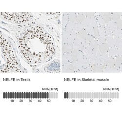 - Immunohistochemical staining of RDBP in human testis and skeletal muscle tissues using RDBP Polyclonal Antibody (Product # PA5-52398). Corresponding NELFE RNA-seq data are presented for the same tissues.