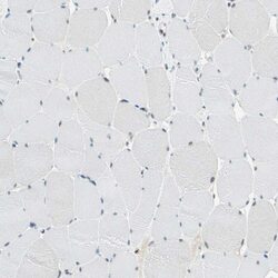 - Immunohistochemical staining of RDBP in human skeletal muscle using RDBP Polyclonal Antibody (Product # PA5-52398) shows no positivity in striated muscle fibers as expected.