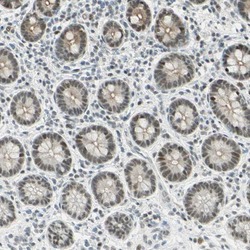- Immunohistochemical staining of RDBP in human small intestine using RDBP Polyclonal Antibody (Product # PA5-52398) shows weak to moderate nuclear positivity in glandular cells.
