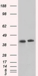 - HEK293T cells were transfected with the pCMV6-ENTRY control (Left lane) or pCMV6-ENTRY ACAT2 (Right lane) cDNA for 48 hrs and lysed. Equivalent amounts of cell lysates (5 ug per lane) were separated by SDS-PAGE and immunoblotted with anti-ACAT2.