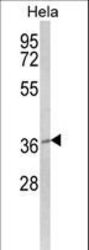 - Western blot of MOSC2 Antibody in HeLa cell line lysates (35 ug/lane). MOSC2 (arrow) was detected using the purified antibody.