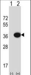 - Western blot of MOSC2 (arrow) using rabbit polyclonal MOSC2 Antibody. 293 cell lysates (2 ug/lane) either nontransfected (Lane 1) or transiently transfected (Lane 2) with the MOSC2 gene.