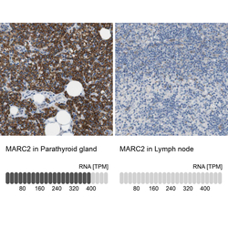 - Immunohistochemistry analysis in human parathyroid gland and lymph node tissues using HPA015085 antibody. Corresponding MARC2 RNA-seq data are presented for the same tissues.
