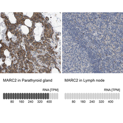 - Immunohistochemistry analysis in human parathyroid gland and lymph node tissues using HPA017572 antibody. Corresponding MARC2 RNA-seq data are presented for the same tissues.