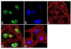 - Immunofluorescence was performed on fixed and permeabilized NTERA-2 cells for detection of SOX21 using Anti-SOX21 Rabbit Polyclonal Antibody (Product # 720156, 2 µg/mL) and labeled with Goat anti-Rabbit IgG (Heavy Chain) Superclonal™ Secondary Antibody, Alexa Fluor® 488 conjugate (Product # A27034, 1:2000). Panel a) shows representative cells that were stained for detection and localization of SOX21 protein (green), Panel b) is stained for nuclei (blue) using SlowFade® Gold Antifade Mountant with DAPI (Product # S36938). Panel c) represents cytoskeletal F-actin staining using Alexa Fluor® 555 Rhodamine Phalloidin (Product # R415, 1:300). Panel d) is a composite image of Panels a, b and c clearly demonstrating nuclear localization of SOX21. Panel e) represents control cells with no primary antibody to assess background.