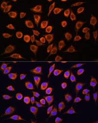- Immunofluorescence analysis of L929 cells using FXN/ Frataxin rabbit polyclonal antibody (STJ113368) at dilution of 1:100. Blue: DAPI for nuclear staining.