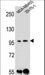 - PCDH1 Antibody western blot of MDA-MB453,ZR-75-1 cell line lysates (35 ug/lane). The PCDH1 antibody detected the PCDH1 protein (arrow).