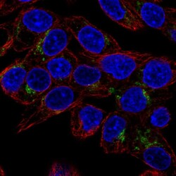 - Immunofluorescent staining of human cell line Hep G2 shows localization to the Golgi apparatus.