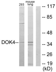 - Western blot analysis of lysates from 293 and mouse lung, using DOK4 Antibody. The lane on the right is blocked with the synthesized peptide.