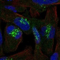 - Immunofluorescent staining of human cell line RH-30 shows localization to the Golgi apparatus.