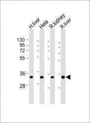 - All lanes: Anti-TST Antibody (Center) at 1:2000 dilution. Lane 1: human liver lysate. Lane 2: HeLa whole cell lysate. Lane 3: rat kidney lysate. Lane 4: rat liver lysate Lysates/proteins at 20 ug per lane. Secondary Goat Anti-Rabbit IgG, (H+L), Peroxidase conjugated at 1:10000 dilution. Predicted band size: 33 kDa. Blocking/Dilution buffer: 5% NFDM/TBST.