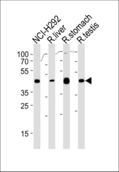 - PCGF6 Antibody western blot of NCI-H292,rat liver,stomach and testis cell line lysates (35 ug/lane). The PCGF6 antibody detected the PCGF6 protein (arrow).
