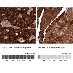 - Immunohistochemical staining of REXO2 in human parathyroid gland and skeletal muscle tissues using REXO2 Polyclonal Antibody (Product # PA5-58395). Corresponding REXO2 RNA-seq data are presented for the same tissues.