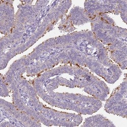 - Immunohistochemical staining of TEKT4 in human fallopian tube using TEKT4 Polyclonal Antibody (Product # PA5-61781) shows distinct positivity in cilia of glandular cells.