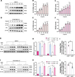 - Fig. 4 Autophagy degradation disorder after Sidt2 deletion in mouse kidney cells. A LC3-II and P62 expression by MPC5 cells incubated for 16 h with 0, 10, 25, 50, 100, or 200 muM CQ shown by western blot; B LC3-II statistical chart of MPC5 cells; C P62 statistical chart of MPC5 cells; D SV40 MES 13 cell incubation for 16 h with 0, 10, 25, 50, 100, or 200 muM CQ. Western blot shows LC3-II and P62 expression; E LC3-II statistical chart of SV40 MES 13 cells; F SV40 MES 13 cell P62 statistical chart; G determination whether CQ induces the expression of key autophagy proteins before and after Sidt2 knockout in MPC5 cells; H statistical chart of ( G ); I changes in the autophagy flux in MPC5 cells on Sidt2 knockout (LC3-II + CQ/beta-Actin)/(LC3-II - CQ/beta-Actin) (ref. []); J determination whether chloroquine induces the expression of key autophagy proteins before and after Sidt2 knockout in SV40 MES 13 cells; K statistical chart of ( J ); L changes of the autophagy flux in SV40 MES 13 cells on Sidt2 knockout (LC3-II + CQ/beta-Actin)/(LC3-II - CQ/beta-Actin) (ref. []). * P < 0.05, ** P < 0.01, *** P < 0.001.