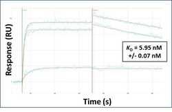 - Surface Plasmon Resonance of SIDT2 polyclonal antibody (Product # PA5-69064). Purified polyclonal antibodies were immobilized on a Protein A/G coated Carterra LSA sensor chip at concentrations of 0.5, 5, and 50 µg/mL. Antibodies on the surface were exposed to interaction with peptides sequentially via microfluidic controlled flow at 333 nm peptide concentration for kinetic characterization of the binders for affinity and specificity, followed by curve fitting using the Kinetics software. Kd determinations for either two or three concentrations were averaged and results and standard deviation are shown.