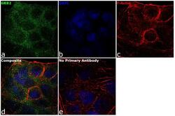 - Immunofluorescence analysis of GRB2 was performed using 70% confluent log phase A-431 cells. The cells were fixed with 4% paraformaldehyde for 10 minutes, permeabilized with 0.1% Triton™ X-100 for 15 minutes, and blocked with 1% BSA for 1 hour at room temperature. The cells were labeled with GRB2 Rabbit Polyclonal Antibody(Product # PA5-17692) at 1:100 dilution in 0.1% BSA, incubated at 4 degree Celsius overnight and then labeled with Goat anti-Rabbit IgG (Heavy Chain) Superclonal™ Secondary Antibody, Alexa Fluor® 488 conjugate (Product # A27034) at a dilution of 1:2000 for 45 minutes at room temperature (Panel a: green). Nuclei (Panel b: blue) were stained with SlowFade® Gold Antifade Mountant with DAPI (Product # S36938). F-actin (Panel c: red) was stained with Rhodamine Phalloidin (Product # R415, 1:300). Panel d represents the merged image showing cytoplasmic localization. Panel e represents control cells with no primary antibody to assess background. The images were captured at 60X magnification.