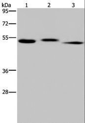 - Western blot analysis of Human kidney tissue, HepG2 cell and human testis tissue, using HYAL3 Polyclonal Antibody at dilution of 1:400.