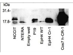 - Western blot using Rockland's affinity purified anti-Cripto-1 antibody shows detection of endogenous and transfected Cripto-1 from mouse and human sources. The Cripto-1 band appears above the 17.8 kDa marker. Endogenous detection is shown using mouse P19 embryonal carcinoma cells and human NCCIT testicular embryonal carcinoma cells. EpH4 CR-1 is a mouse mammary epithelial cell line stably expressing mouse Cripto-1. NTERA cells are human embryonal carcinoma cells that, when overgrown, differentiate and lose Cripto-1 expression. COS7 cells transfected with human Cripto-1 expression vector were used as a positive control and EpH4 WT cells were used as a negative control. A non-specific band at 45kDa may be present in some preparations. The primary antibody was used at a 1:500 dilution. Personal communication, C. Bianco, NCI, Bethesda, MD