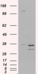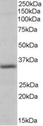 - Pirin / PIR antibody (0.3µg/ml) staining of Human Heart lysate (35µg protein in RIPA buffer). Detected by chemiluminescence.