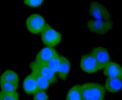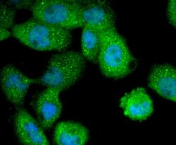 - Immunocytochemical analysis of Cytokeratin 4 in A431 cells using a Cytokeratin 4 Monoclonal antibody (Product # MA5-32319) as seen in green. The nuclear counter stain is DAPI (blue). Cells were fixed in paraformaldehyde, permeabilised with 0.25% Triton X100/PBS.