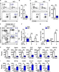 - Figure 1. Arrested NK cell maturation in Id2 Delta/Delta mice. (A) Flow cytometry showing gating strategy for BM NK cells in Ctrl and Id2 Delta/Delta mice. Top panels show lineage (Lin; CD3e)/PI versus NK1.1 on lymphoid cells in the BM. Lower panels show NK1.1 versus CD49b on Lin/PI-NK1.1 + cells. The percentage of cells in the gate is indicated. (B) Summary of the number of NK cells per 10 8 BM cells. Bar represents the average +- SEM. Ctrl (white) and Id2 Delta/Delta (blue). Each circle represents one mouse. (C) Same as A but for spleen. (D) Same as B but for spleen. (E) CD49b + NK1.1 + NK cells from the BM (top) or spleen (bottom) were examined for expression of CD27 and CD11b by flow cytometry. The percentage of cells in each quadrant is indicated. (F and G) Summary of the number of CD27 + CD11b - , CD27 + CD11b + , and CD27 - CD11b + NK cells per 10 8 BM cells or per spleen ( n = 5 for BM and n = 3 for spleen [Sp]; data are from independent experiments). (H and I) RNA expression for the indicated genes in Ctrl or Id2 Delta/Delta determined by RNA-seq and expressed as normalized reads. Data are from three biological replicates. Error bars represent SD. Statistical significance was determined by two-tailed unpaired t test. *, P < 0.05; **, P < 0.01; ***, P < 0.005.