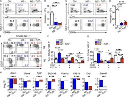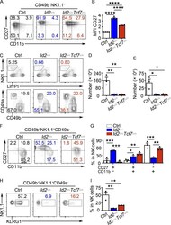 - Figure S3. TCF1 deficiency partially rescues ID2-deficient NK cell maturation in the BM and liver. (A) CD49b + -enriched NK cells from BM were culture in 20 ng/ml IL-15 for 6 d, after which NK1.1 + CD49b + cells were analyzed for CD27 and CD11b by flow cytometry. Numbers indicate the percentage of cells in the respective quadrant ( n > 4 from independent experiments). (B) Summary of CD27 MFI for n = 4 in A. MFI of Ctrl NK cells was set as 1 in each experiment. (C) Liver from Id2 Delta/Delta Tcf7 Delta/Delta , Id2 Delta/Delta , and Ctrl mice were analyzed by flow cytometry for NK and ILC1 cells. The top panels were from lymphocyte gate, and the bottom panels were from lineage (Lin)/PI - NK1.1 + gate. NK cells are defined as NK1.1 + CD49b + CD49a - , and ILC1 cells are defined as NK1.1 + CD49b - CD49a + . Numbers are the percentage of cells in the indicated gates ( n = 3 from three independent experiments). (D and E) Summary of data shown in C for NK cell and ILC1 cell numbers per 10 8 cells. (F) NK1.1 + CD49b + CD49a - NK cells from the liver were analyzed by flow cytometry for CD27 and CD11b. Numbers indicate the percentage of cells in the respective quadrant ( n = 3 from three independent experiments). (G) Summary of data shown in F for frequencies of different NK cell subsets. (H) Flow cytometry plots of KLRG1 expression in Id2 Delta/Delta Tcf7 Delta/Delta , Id2 Delta/Delta , and Ctrl mice. Numbers indicate the percentage of cells in the respective quadrant ( n = 3; data ar