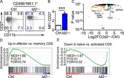 - Figure S1. Alterations in gene expression in Id2 Delta/Delta BM NK cells. (A) CD49b + -enriched NK cells from BM were culture in 20 ng/ml IL-15 for 6 d, and then NK1.1 + CD49b + NK cells were analyzed for CD27 and CD11b by flow cytometry. Numbers indicate the percentage of cells in the respective quadrant ( n = 4 from four independent experiments). (B) Summary of relative CD27 MFI. MFI of Ctrl NK cells was set as 1 in each experiment. Error bars represent SEM. Statistical significance was determined by two-tailed unpaired t test. ***, P < 0.005. (C) Volcano plot showing Log2FC versus adj. P value for RNA-seq data from Id2 Delta/Delta and Ctrl NK cells. Data are combined from three biological replicates. (D and E) Example of enrichment data from GSEA of Ctrl and Id2 Delta/Delta RNA-seq data. FDR, false discovery rate; NES, normalized enrichment score.