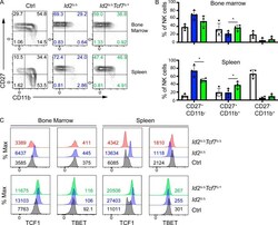 - Figure 3. Deletion of Tcf7 in mature NK cells impacts their numbers and maturation. (A) Flow cytometry for BM NK cells in Ctrl and Tcf7 Delta/Delta mice. Top panels show lineage (Lin)/PI versus NK1.1 on lymphoid cells. Bottom panels show NK1.1 versus CD49b on Lin/PI-NK1.1 + cells. The percentage of cells in the gated region is indicated. (B) Summary of the number of NK cells per 10 8 BM cells in Ctrl (white) and Tcf7 Delta/Delta (maroon). Bars represent the average +- SEM. Each circle represents one mouse ( n = 5). (C) Same as A but for spleen. (D) Same as B but for spleen ( n = 4). (E) NK1.1 + CD49b + NK cells from BM (top) or spleen (Sp; bottom) were examined for expression of CD27 and CD11b by flow cytometry. Numbers indicate the percentage of cells in the respective quadrant. (F and G) Summary of the percentage of CD27 + CD11b - , CD27 + CD11b + , and CD27 - CD11b + NK cells among CD49b + NK1.1 + NK cells in BM and in spleen ( n = 3; all flow cytometry data are from independent experiments). (H) RNA expression for the indicated genes in Ctrl or Tcf7 Delta/Delta NK cells determined by RNA-seq and expressed as normalized reads. Data represent three biological replicates. Error bars represent SD. Statistical significance was determined by two-tailed unpaired t test. *, P < 0.05; **, P < 0.01; ***, P < 0.005.