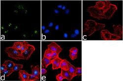 - Immunofluorescence analysis of ETS (pS282/pS285) was done on 70% confluent log phase A549 cells. The cells were fixed with 4% paraformaldehyde for 15 minutes, permeabilized with 0.25% Triton™ X-100 for 10 minutes, and blocked with 5% BSA for 1 hour at room temperature. The cells were labeled with ETS (pS282/pS285) Rabbit Polyclonal Antibody (Product # 44-1111G) at 1:250 dilution in 1% BSA and incubated for 3 hours at room temperature and then labeled with Goat anti-Rabbit IgG (H+L) Superclonal™ Secondary Antibody, Alexa Fluor® 488 conjugate (Product # A27034) at a dilution of 1:2000 for 45 minutes at room temperature (Panel a: green). Nuclei (Panel b: blue) were stained with SlowFade® Gold Antifade Mountant with DAPI (Product # S36938). F-actin (Panel c: red) was stained with Rhodamine Phalloidin (Product # R415, 1:300). Panel d is a merged image showing Nuclear localization. Panel e is a no primary antibody control. The images were captured at 60X magnification.
