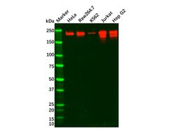 - BRG1 Mouse mAb (Ab091716) - Western Blot All lanes: BRG1 Mouse mAb (Ab091716) at 1/1000 dilution Samples: Lysates at 20 µg per lane Secondary: Goat Anti-Mouse IgG H&L (HRP) (Ab138040) at 1/30000 dilution Predicted band size: 220 kDa Observed band size: 213 kDa Exposure time: 61.7 s