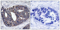 - Immunohistochemistry analysis of paraffin-embedded human breast carcinoma tissue, using p62 Dok Antibody. The picture on the right is blocked with the synthesized peptide.