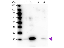 - Western blot of rabbit Anti-Myosin pS19/pS20 primary antibody. Lane 1: Regulatory Light Chain Non-Phospho recombinant protein. Lane 2: Regulatory Light Chain Phospho recombinant protein. Lane 3: Smooth Muscle Non-Phospho recombinant protein. Lane 4: Smooth Muscle Phospho recombinant protein. Load: 50 ng per lane. Primary antibody: Myosin pS19/pS20 primary antibody at 1:1,000 overnight at 4°C. Secondary antibody: Peroxidase rabbit secondary antibody at 1:40,000 for 60 min at RT. Blocking: MB-070 for 30 min at RT. Predicted/Observed size: 20 kDa, 20 kDa for Regulatory Light Chain Phospho. Other band(s): None.