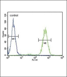 - Flow cytometry of SLC25A37 in MDA-MB231 cells (right histogram). Samples were incubated with SLC25A37 polyclonal antibody (Product # PA5-26720) followed by FITC-conjugated goat-anti-rabbit secondary antibody. Negative control cell (left histogram).