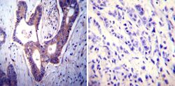 - Immunohistochemistry was performed on cancer biopsies of deparaffinized Human colon carcinoma tissues. To expose target proteins, heat induced antigen retrieval was performed using 10mM sodium citrate (pH6.0) buffer, microwaved for 8-15 minutes. Following antigen retrieval tissues were blocked in 3% BSA-PBS for 30 minutes at room temperature. Tissues were then probed at a dilution of 1:100 with a mouse monoclonal antibody recognizing PMCA ATPase (Product # MA3-914) or without primary antibody (negative control) overnight at 4°C in a humidified chamber. Tissues were washed extensively with PBST and endogenous peroxidase activity was quenched with a peroxidase suppressor. Detection was performed using a biotin-conjugated secondary antibody and SA-HRP, followed by colorimetric detection using DAB. Tissues were counterstained with hematoxylin and prepped for mounting.
