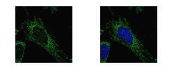 - SUCLG1 antibody detects SUCLG1 protein at mitochondria by confocal immunofluorescent analysis. HeLa cells were fixed in 2% paraformaldehyde/culture medium at 37 for 30 min. SUCLG1 protein stained by SUCLG1 antibody diluted at 1:500.