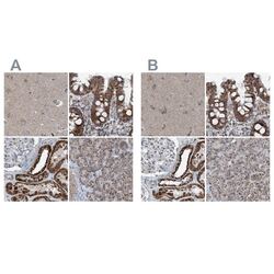 - Immunohistochemical staining of SUCLG1 in human cerebral cortex, colon, kidney and pancreas using SUCLG1 Polyclonal Antibody (Product # PA5-57766) (A) shows similar protein distribution across tissues to an independent SUCLG1 Polyclonal Antibody (B).