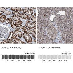 - Immunohistochemical staining of SUCLG1 in human kidney and pancreas tissues using SUCLG1 Polyclonal Antibody (Product # PA5-57766). Corresponding SUCLG1 RNA-seq data are presented for the same tissues.