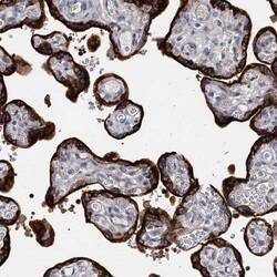 - Immunohistochemical analysis of MORN3 in human placenta using MORN3 Polyclonal Antibody (Product # PA5-58505) shows strong cytoplasmic positivity in trophoblastic cells.