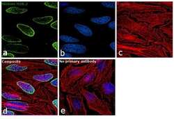 - Immunofluorescence analysis of Histone H2B.2 was performed using 70% confluent log phase HeLa cells. The cells were fixed with 4% paraformaldehyde for 10 minutes, permeabilized with 0.1% Triton™ X-100 for 10 minutes, and blocked with 1% BSA for 1 hour at room temperature. The cells were labeled with Histone H2B.2 Rabbit Polyclonal Antibody (Product # PA5-48430) at 1:100 dilution in 0.1% BSA and incubated overnight at 4 degree and then labeled with Goat anti-Rabbit IgG (H+L) Superclonal™ Secondary Antibody, Alexa Fluor® 488 conjugate (Product # A27034) at a dilution of 1:2000 for 45 minutes at room temperature (Panel a: green). Nuclei (Panel b: blue) were stained with SlowFade® Gold Antifade Mountant with DAPI (Product # S36938). F-actin (Panel c: red) was stained with Rhodamine Phalloidin (Product # R415, 1:300). Panel d represents the merged image showing nuclear localization. Panel e represents control cells with no primary antibody to assess background. The images were captured at 60X magnification.
