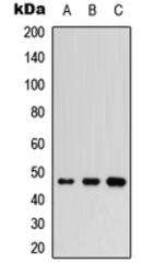 - Western blot analysis of IKK gamma expression in HepG2 (A); PC3 (B); Raw264.7 (C) whole cell lysates.