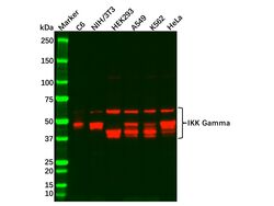 - Recombinant IKK Gamma/NEMO Antibody (Ab109740) - Western Blot All lanes: Recombinant IKK Gamma/NEMO Antibody (Ab109740) at 1/1000 dilution Samples: Lysates at 20 µg per lane Secondary: Goat Anti-Rabbit IgG H&L (HRP) (Ab170144) at 1/20000 dilution Predicted band size: 48 kDa Observed band size: 58, 46, 39 kDa Exposure time: 9.8 s