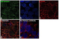 - Immunofluorescence analysis of IKK gamma was performed using HEK-293 cells. The cells were fixed with 4% paraformaldehyde for 10 minutes, permeabilized with 0.1% Triton™ X-100 for 15 minutes, and blocked with 2% BSA for 1 hour at room temperature. The cells were labeled with IKK gamma Mouse Monoclonal Antibody (Product # MA5-15155) at 1:100 dilution in 0.1% BSA and incubated overnight at 4 degree and then labeled with Donkey anti-Mouse IgG (H+L) Highly Cross-Adsorbed Secondary Antibody, Alexa Fluor Plus 488 conjugate (Product # A32766) at a dilution of 1:2000 for 45 minutes at room temperature (Panel a: green). Nuclei (Panel b: blue) were stained with ProLong™ Diamond Antifade Mountant with DAPI (Product # P36962). F-actin (Panel c: red) was stained with Rhodamine Phalloidin (Product # R415, 1:300). Panel d represents the composite image showing cytoplasmic localization of IKK gamma in HEK-293 cells. Panel e represents control cells with no primary antibody to assess background. The images were captured at 60X magnification.